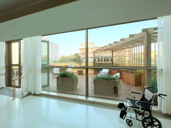 设施特色突出城心区位与功能分区,地上10层,1-4层为医疗配套空间,5-10层为养老房间,楼顶设空中疗愈花园,社区周围设停车场,方便老人使用与子女探望。一层为接待大厅和医疗中心,二层为琴棋书画娱乐健身会所,功能分区明确,适老化设计贯穿全程,如走廊扶手、防滑地面等,保障居住安全与便捷。