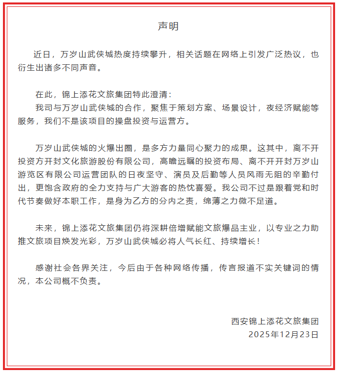 时间倒回2025年初,文旅圈子里开始疯传一个消息:新晋顶流万岁山武侠城,跟专业搞策划的锦上添花公司签了份“对赌协议”。