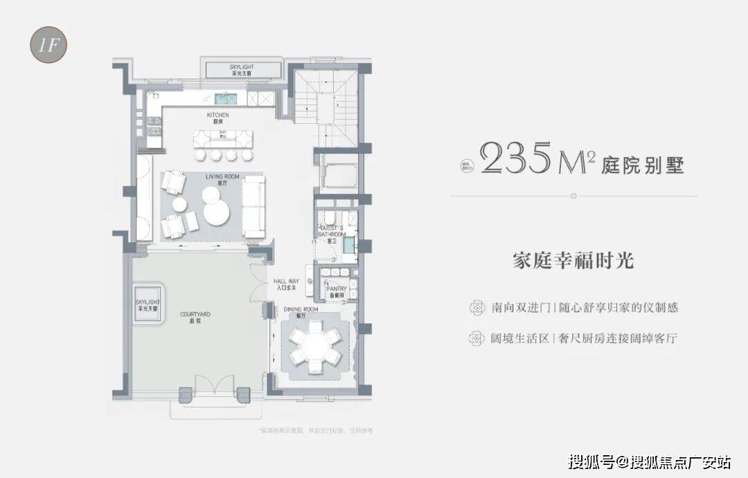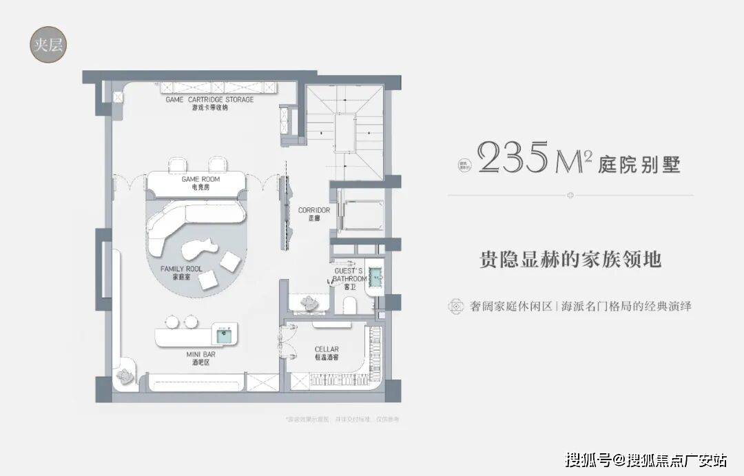 以建面约235㎡的庭院别墅样板房为例,户型附赠地下室、庭院、露台、阁楼空间