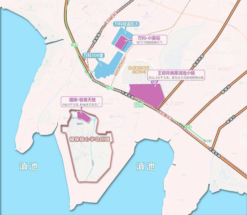 滇池半岛新商圈是由主打家门口的精致烟火气的万科小篆街,与主打新生活方式休闲购物的王府井奥莱滇池小镇,以及主打松弛美学发生厂的福保·容滙天地,不仅在定位上各有特色、互为补充,而且在空间上也形成了半径1.5公里的商业集群。
