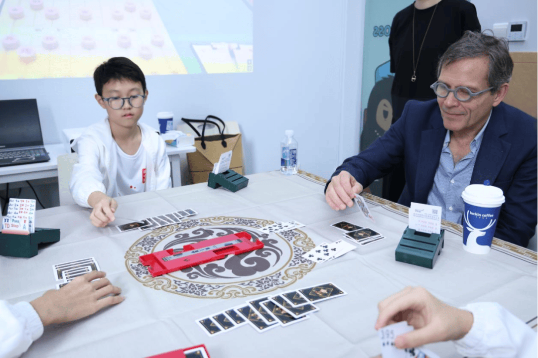 交流渐入高潮,里姆主席欣然接受邀请,与小牌手代表共同落座牌桌,展开了几副牌的友谊切磋。这不是一场紧张的竞技,而是一次充满鼓励的技艺交流:小牌手们虽略有紧张,却依然稳定发挥所学;主席则用温和的眼神、友善的微笑化解孩子们的局促,偶尔还会轻声提示技巧。牌桌上,清脆的叫牌声、默契的击掌声、爽朗的欢笑声交织在一起,完美诠释了桥牌作为“世界通用语言”的独特魅力,也为孩子们留下了与世界桥联主席“过招”的珍贵记忆。
